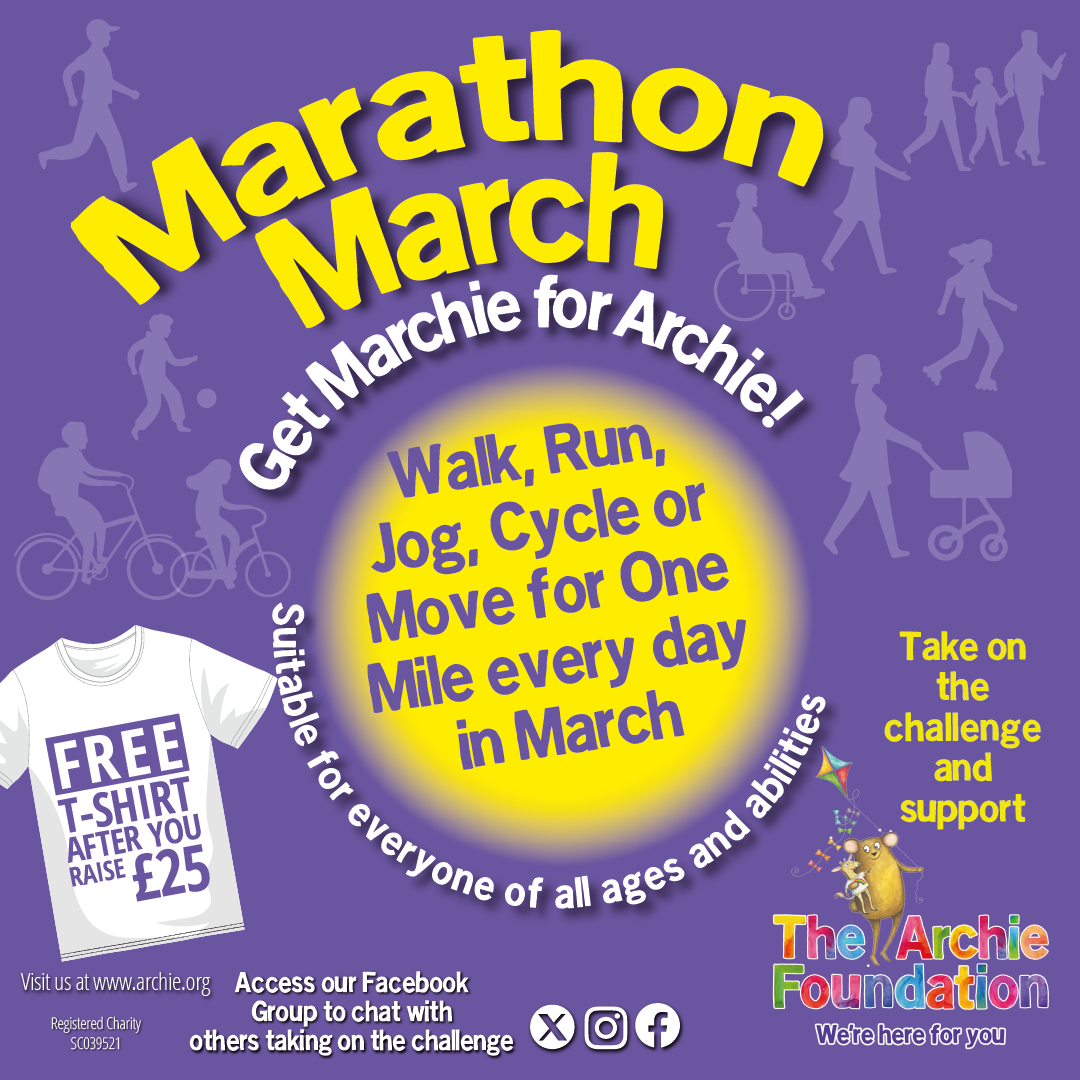 Everyone can take part — walk, roll, swim, bring the dog or push the buggy. Whether you are a school, business or individual, we’d love to have you join the Marchie Archie army!