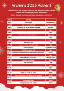 We’re already thrilled to have some amazing days booked into our Advent Calendar, but there are still plenty of opportunities to take part, from sponsorship to Giving Trees and more. To get involved or discuss your ideas, please contact us at hello@archie.org