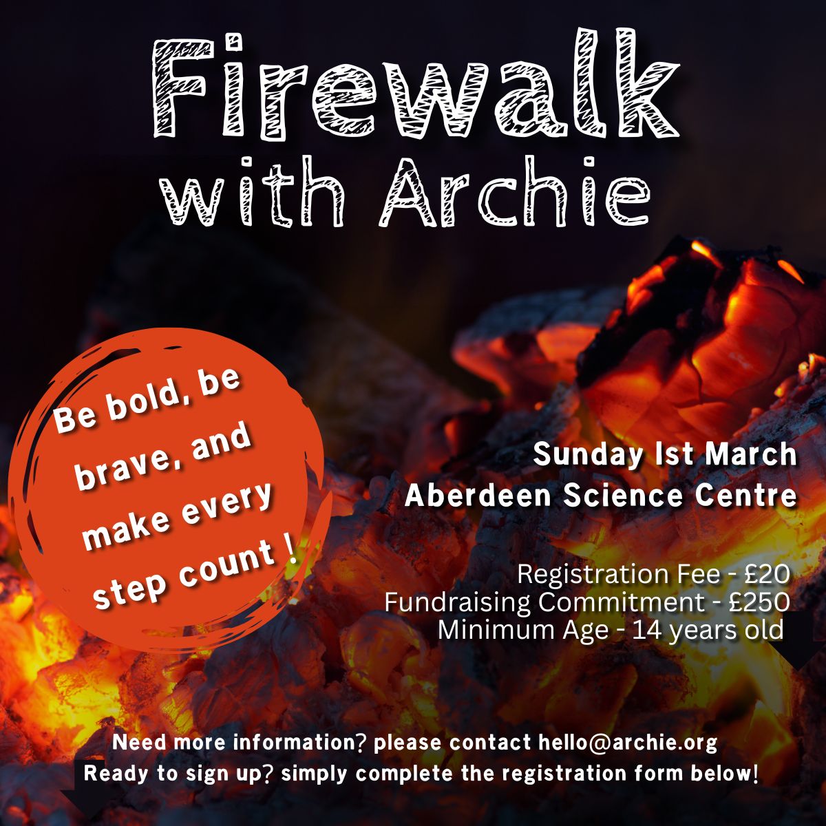 We’re looking for brave soles to take on The Archie Foundation Firewalk Challenge, an unforgettable evening of courage and community at the Aberdeen Science Centre.