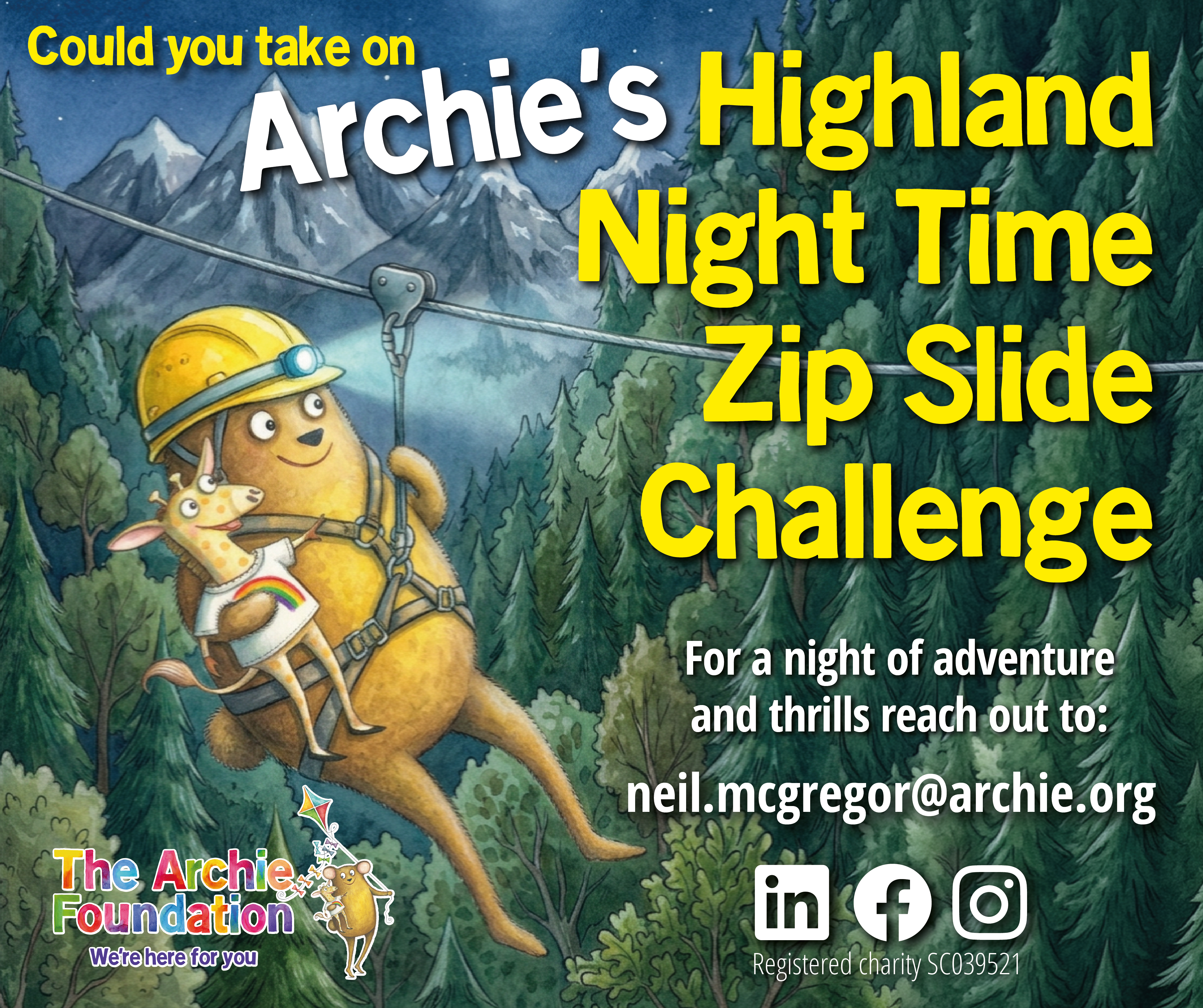 Registration Details: For just a £50 registration fee, you’ll secure your place in this amazing challenge and commit to raising a minimum of £200 in sponsorship to support the vital work of The Archie Foundation. We will provide fundraising support, an “Archie” t-shirt, refreshments and lots of motivational cheering as you slide towards the Zip tower!